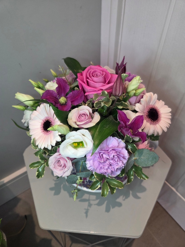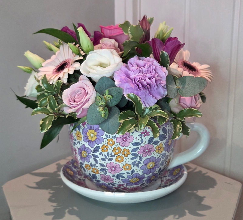Tea Cup and Saucer with a beautiful fresh floral arrangement.