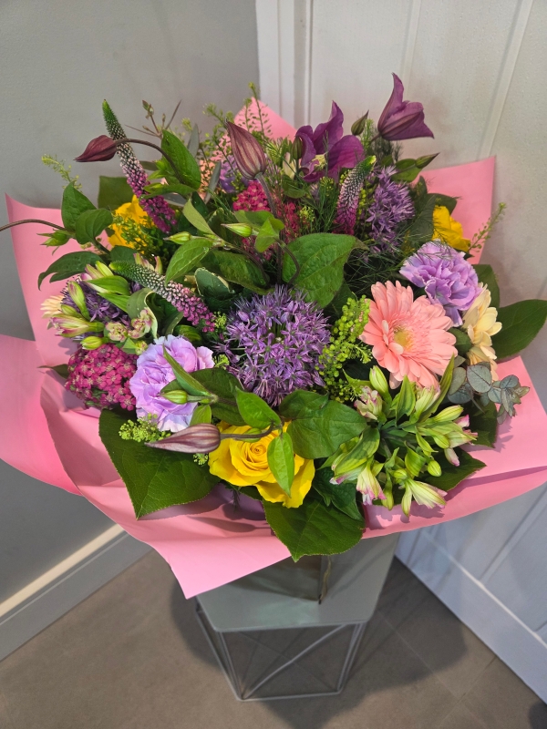 A Vibrant Spring Handtied Arrangement perfect for any Mum who loves her garden and flowers.